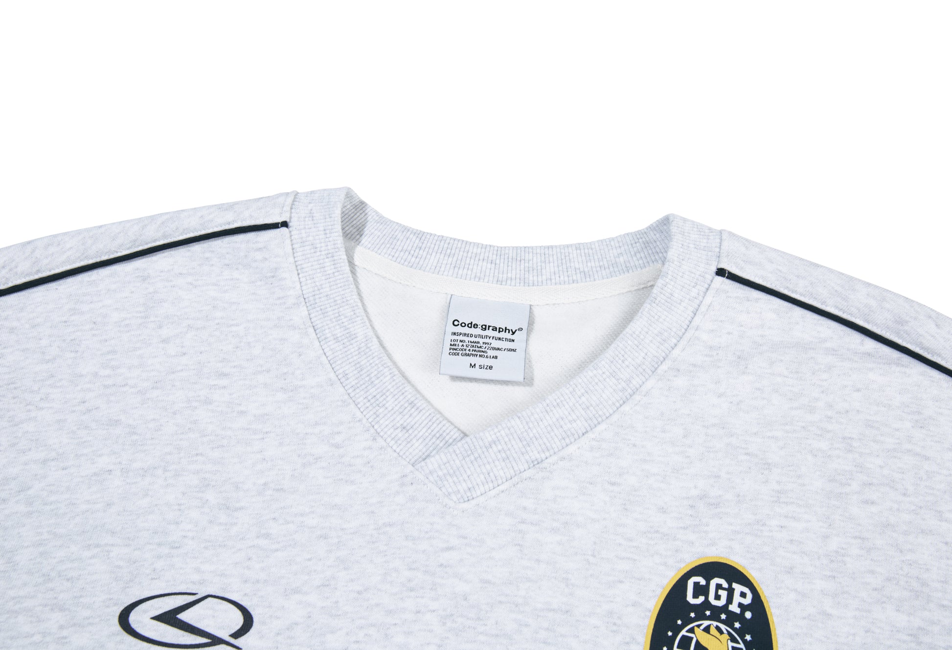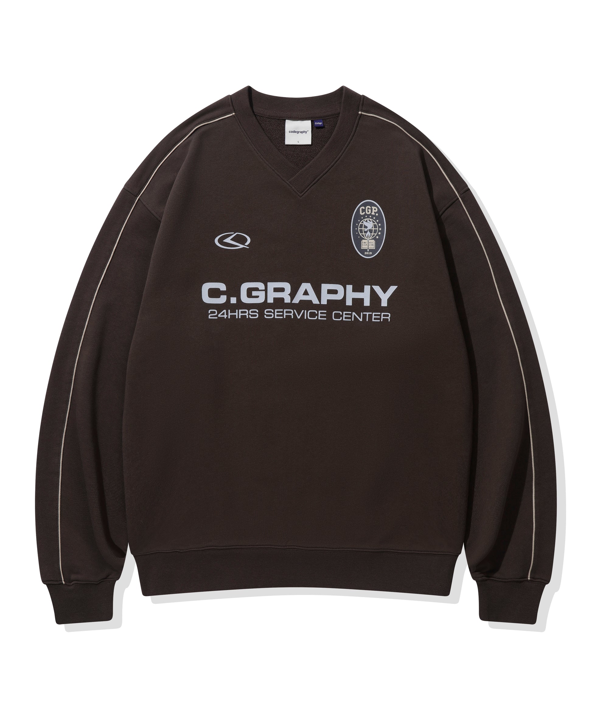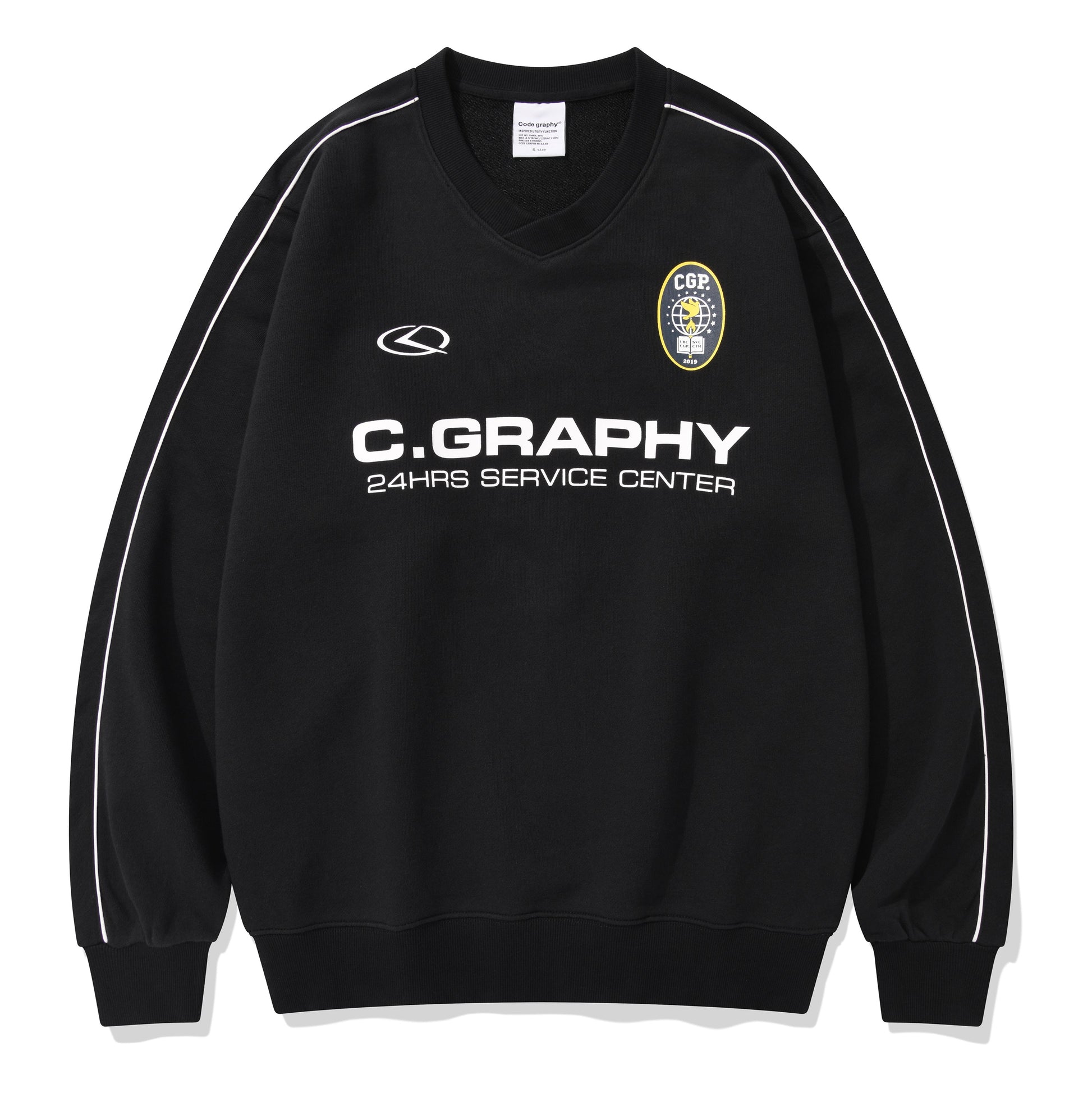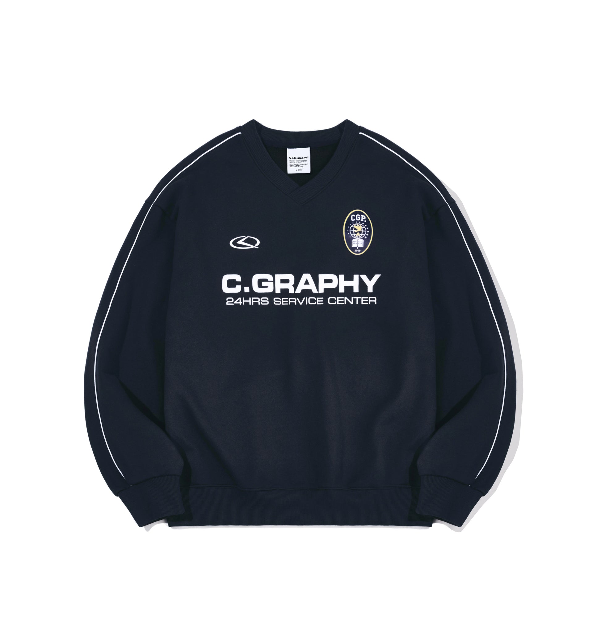 ネック横から袖リブまで入ったパイピングがデザイン性を高め、フロントにはC.GRAPHYのロゴプリントが入っています。