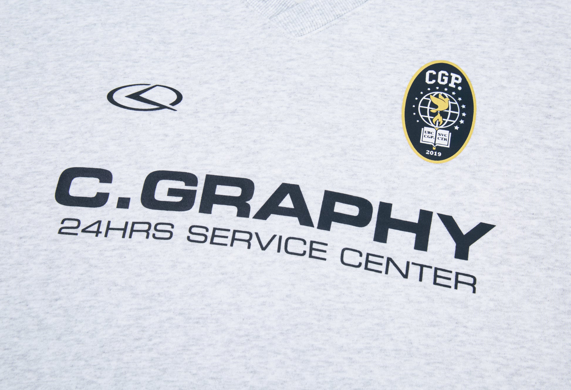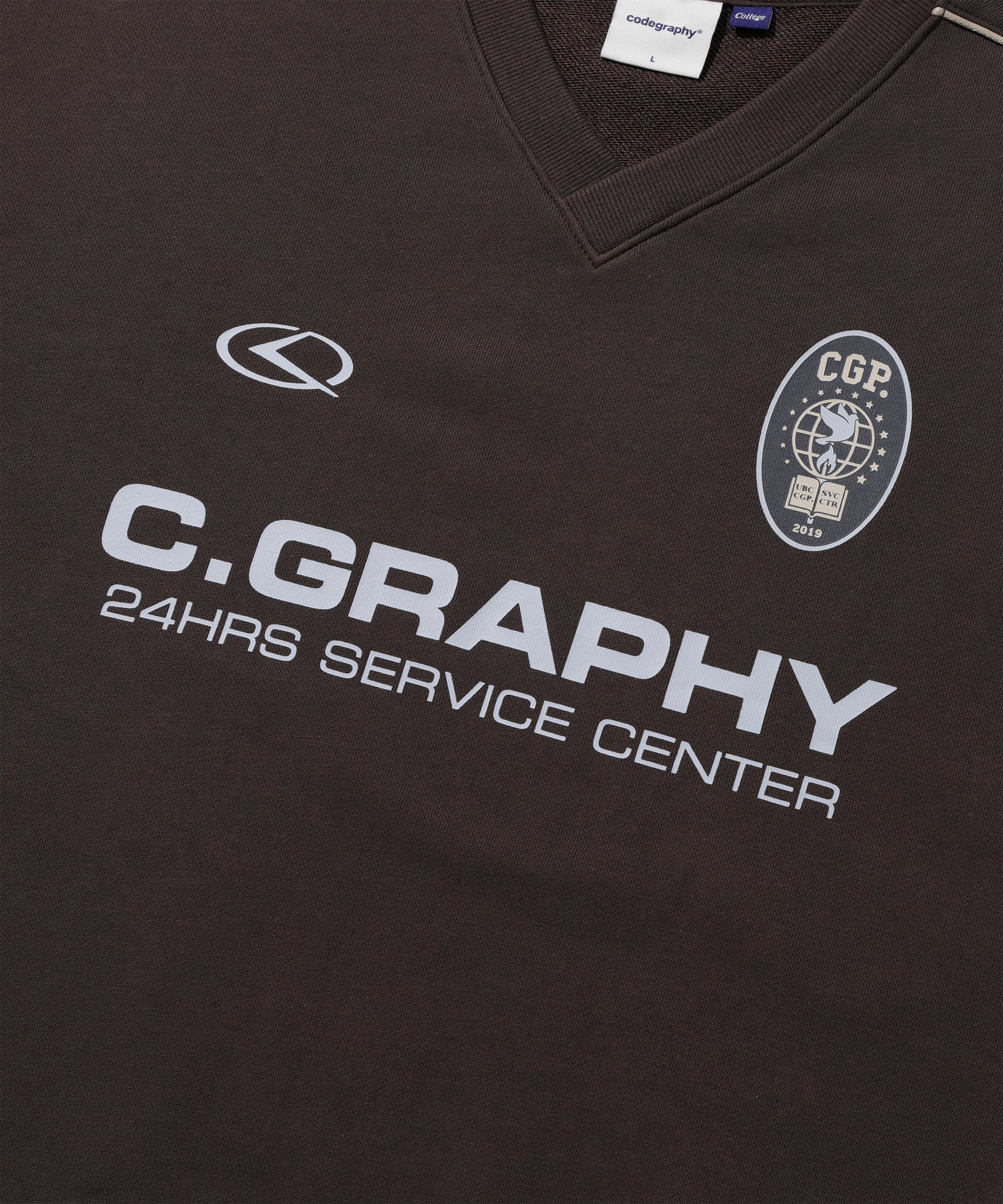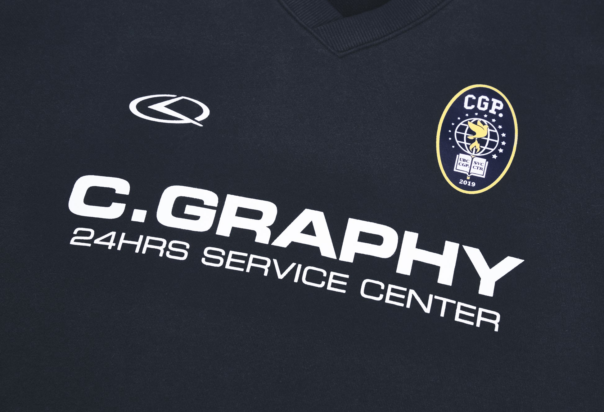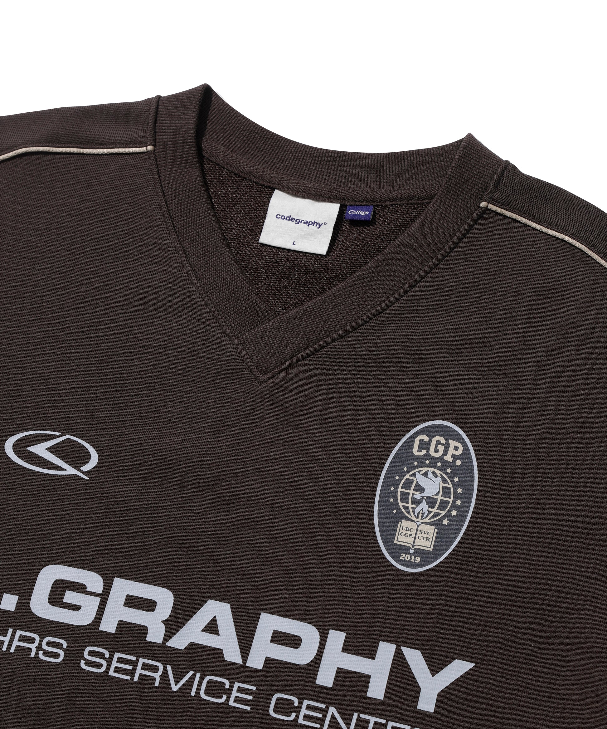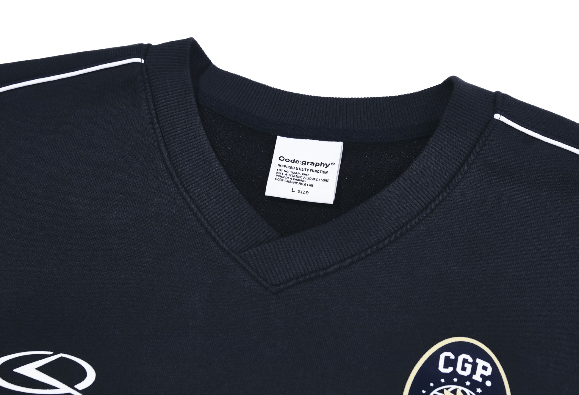 ネック横から袖リブまで入ったパイピングがデザイン性を高め、フロントにはC.GRAPHYのロゴプリントが入っています。