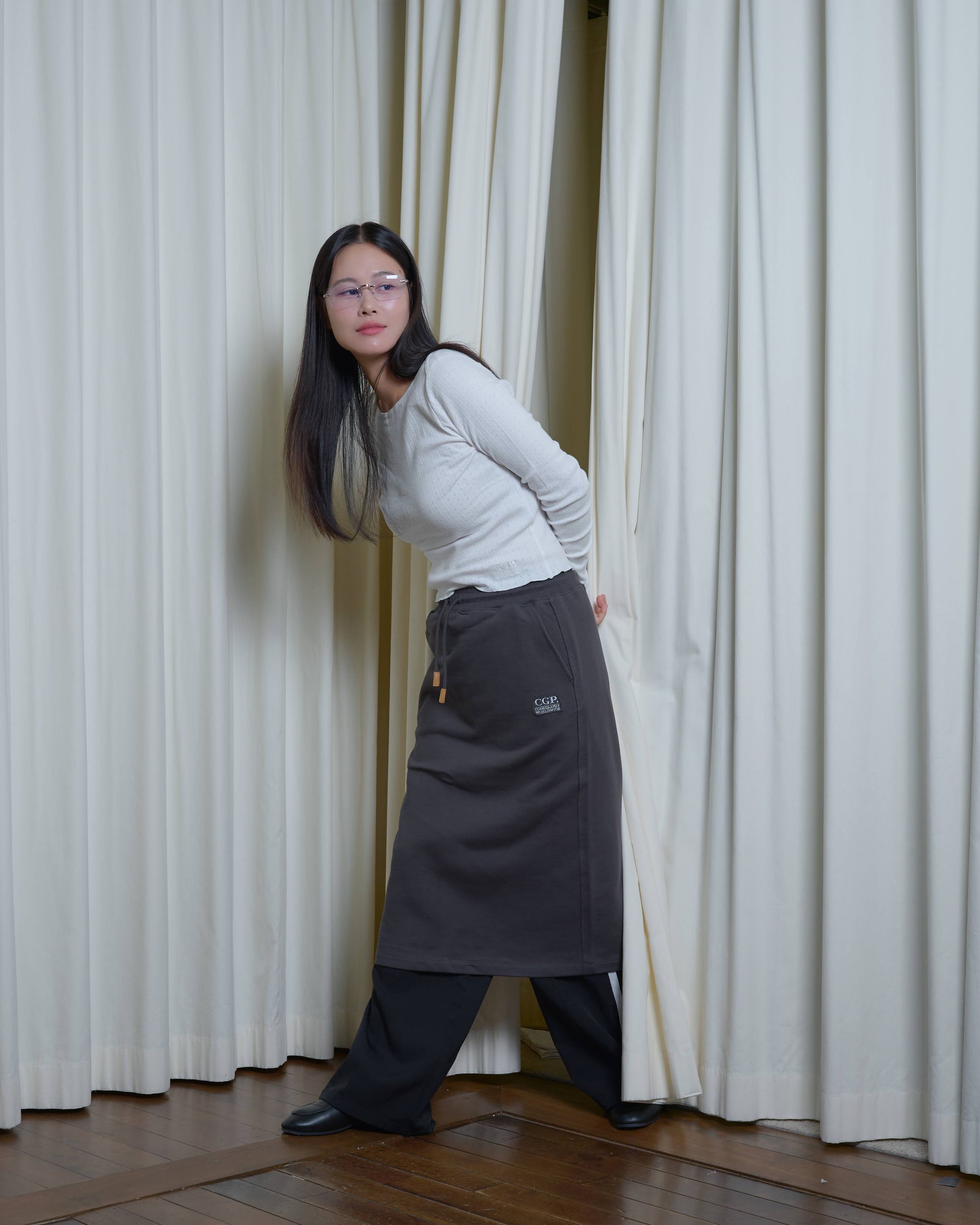 タイトなシルエットで、シアー素材。