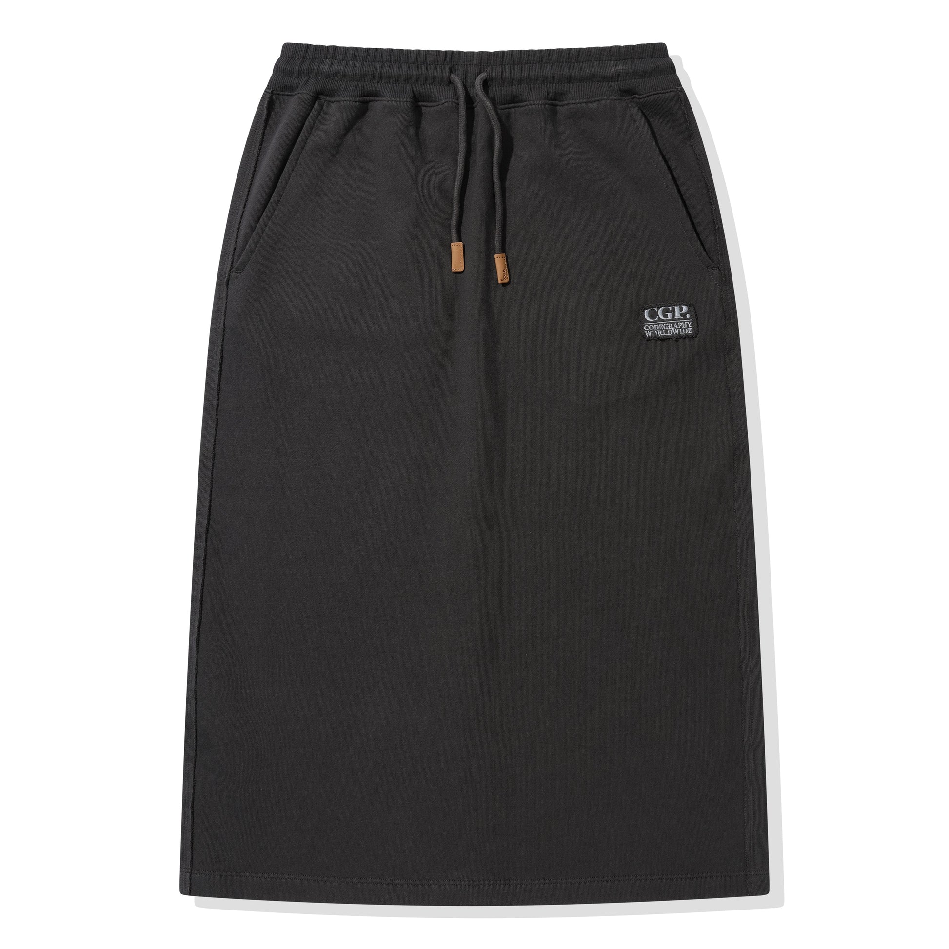 オビ、紐の端にレザーの先端をポイントにしたロング丈のスウェットスカートスタイル。